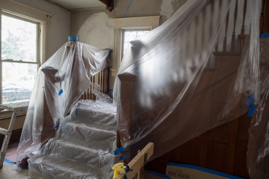 Plastic wrapped stairs