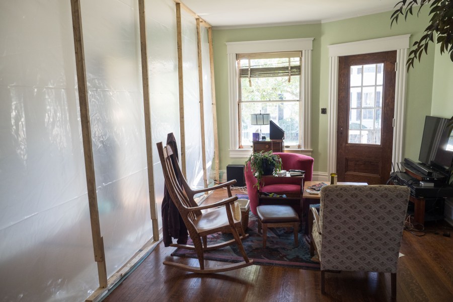 The entire kitchen is separated from the family room and dining room by plastic. Previous image Next image