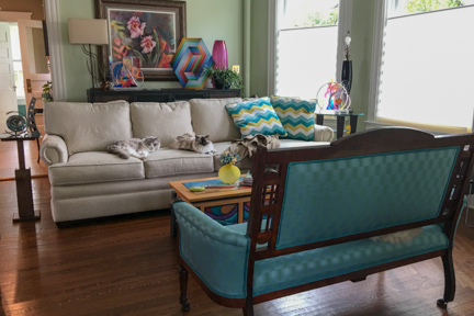 Family room is nearly finished. Couch is from Rider Furniture, settee was found at Empire Antiques. Next image
