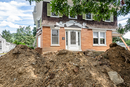 Once the old foundation was removed, they kept on digging to get to the required depth. That left us with a huge pile of dirt in the front of our house. We’ve never had the most appealing front yard, but now it is a mess! My daughter says that it looks like “an archeological dig in the middle of a war zone.”