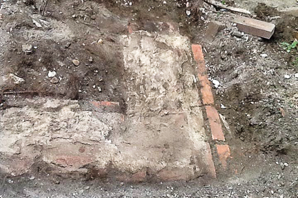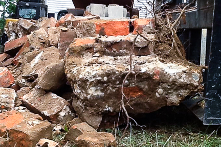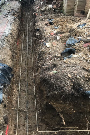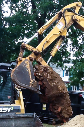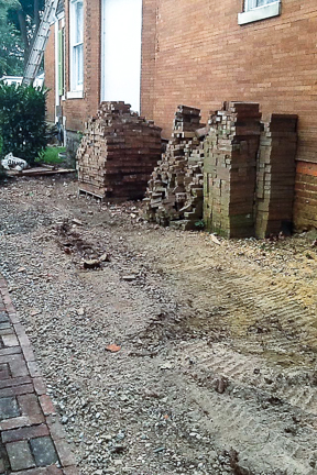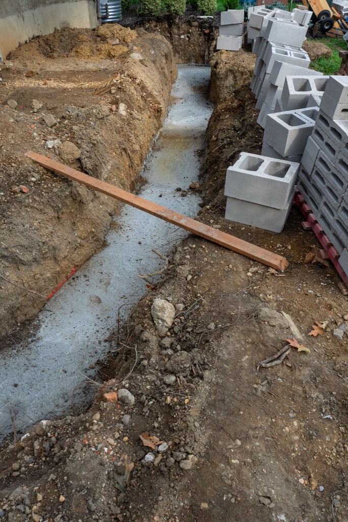 Digging a trench seems so simple, but it was a massive project. The old foundation needed to be dug up and removed. The foundation consisted of poured cement on top. Below that was a mass of old bricks and stone and there were a few tree roots thrown into the mix.