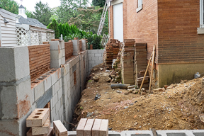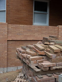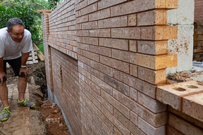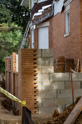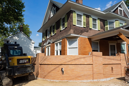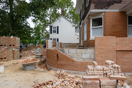 Finally, what we were all waiting for: The Curve. Here you can see a master mason at work. He precisely cut the bricks to create a smooth curve. He also matched the curve to fit the original limestone wall caps.