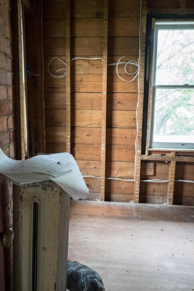 The small room’s walls and ceiling were removed in order to add wiring and plumbing.