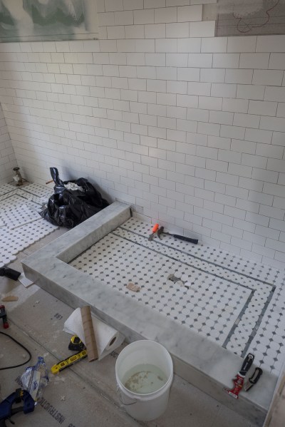 The shower marble floor tiles and threshold.