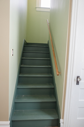 The finished stairwell looking up from the kitchen. The new colors are very similar to the original.