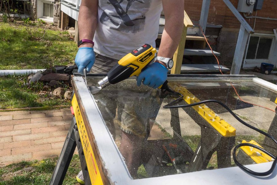 Removing the old window putty with heat.
